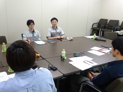 午後からは、石田部長の案内で新設備の稼働準備状況等を見学しました。最後の意見交換会では、入社してから仕事を覚えるまでの様子や他部署との関わり、数学・物理の勉強や学生時代に行っておいたほうが良いこと、会社の繁忙期や残業の状況、海外での生活など突っ込んだ質問もあり、田沼さん・金井さんから丁寧にお答え頂きました。